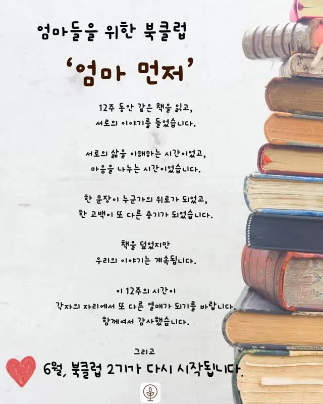 신소영 사모님이 쓰신 ’엄마 먼저‘라는 책을 읽고 나누는 모임입니다. 이 나눔을 통해 복음으로 엄마를 바라보는 시간이 되길 바라며 6월, 2기 모임이 다시 시작됩니다. 😄#언약예배 #세대통합예배 #교회개척 #schaumburg #한인교회 #부모교육 #시카고 #샴버그 #엄마